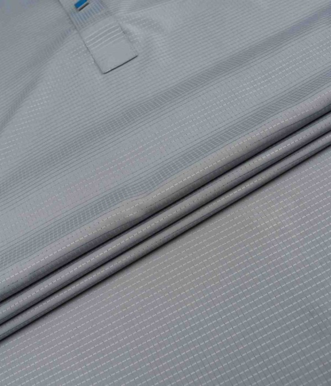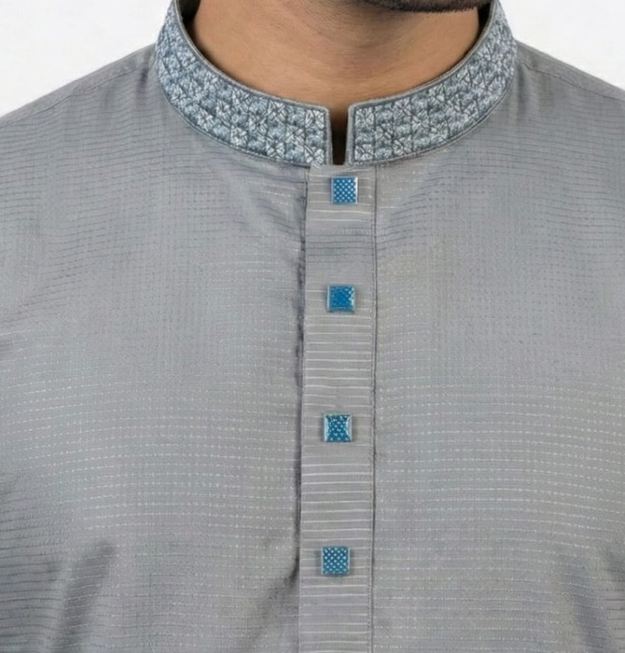 Ash grey cotton Panjabi with contrast embroidered collar and subtle textured pattern. Smart, comfortable, and perfect for festive and formal occasions.