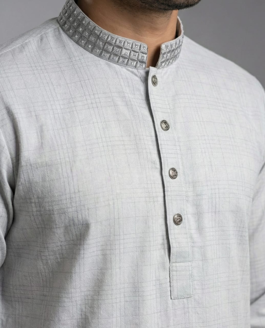 Light grey wool cotton Panjabi with subtle check texture and detailed collar design. Soft and comfortable, perfect for winter and formal occasions.