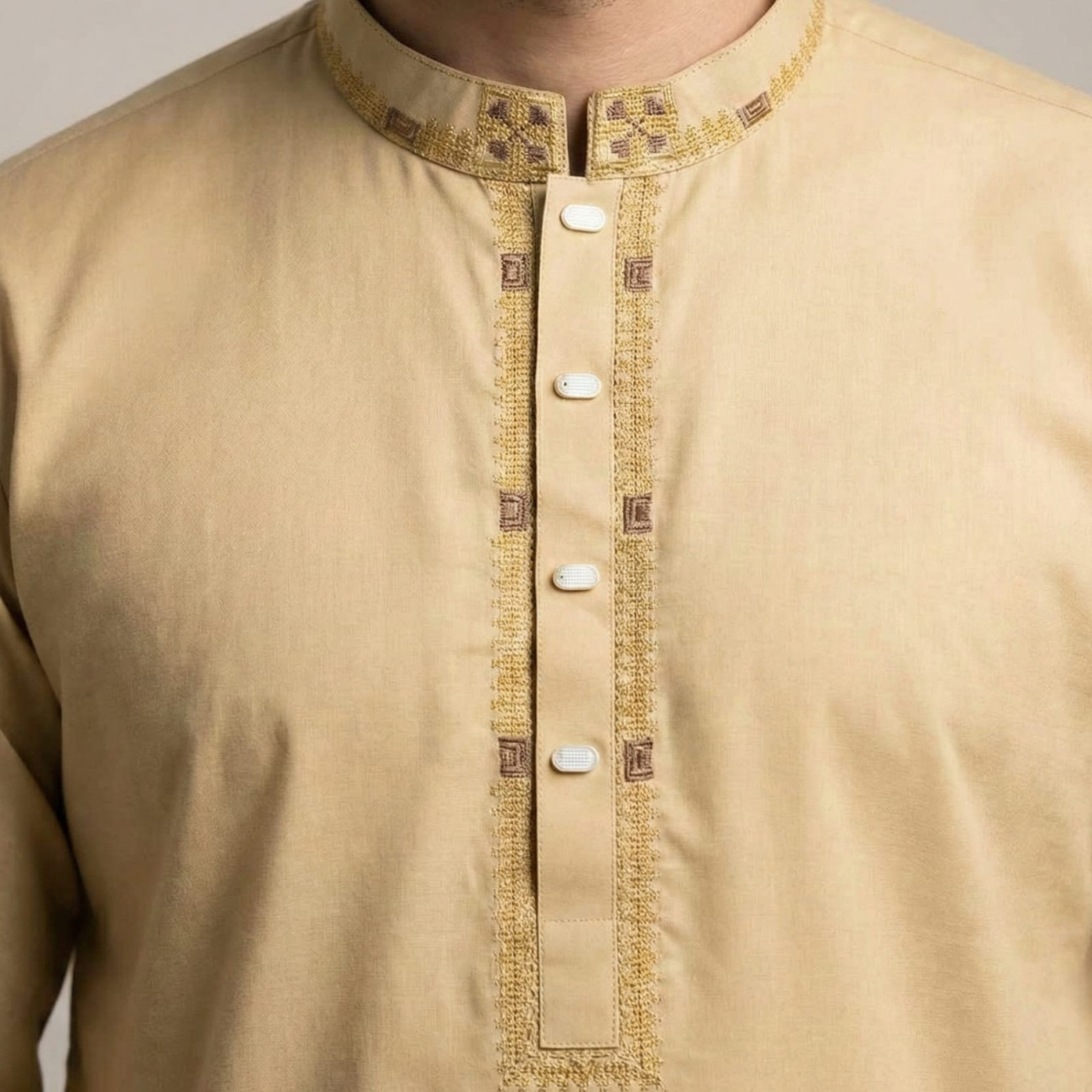 Beige slub cotton Panjabi with detailed embroidered placket and collar design. Soft, breathable, and perfect for festive and traditional wear.