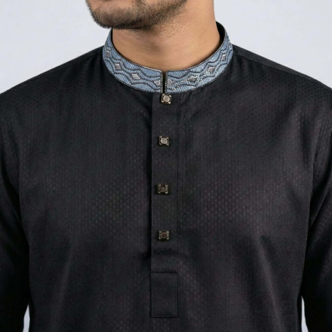 Black cotton Panjabi with contrast embroidered collar. Classic, elegant, and perfect for festive and formal occasions.