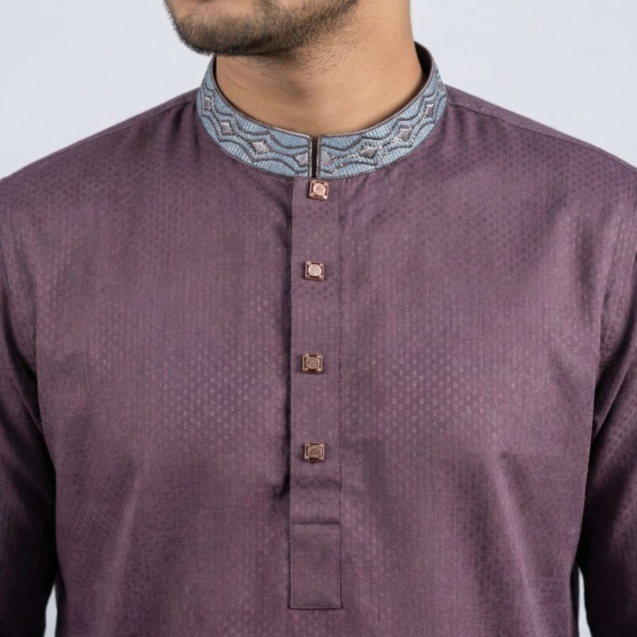 Plum cotton Panjabi with contrast embroidered collar and subtle textured design. Elegant and perfect for festive and formal occasions.