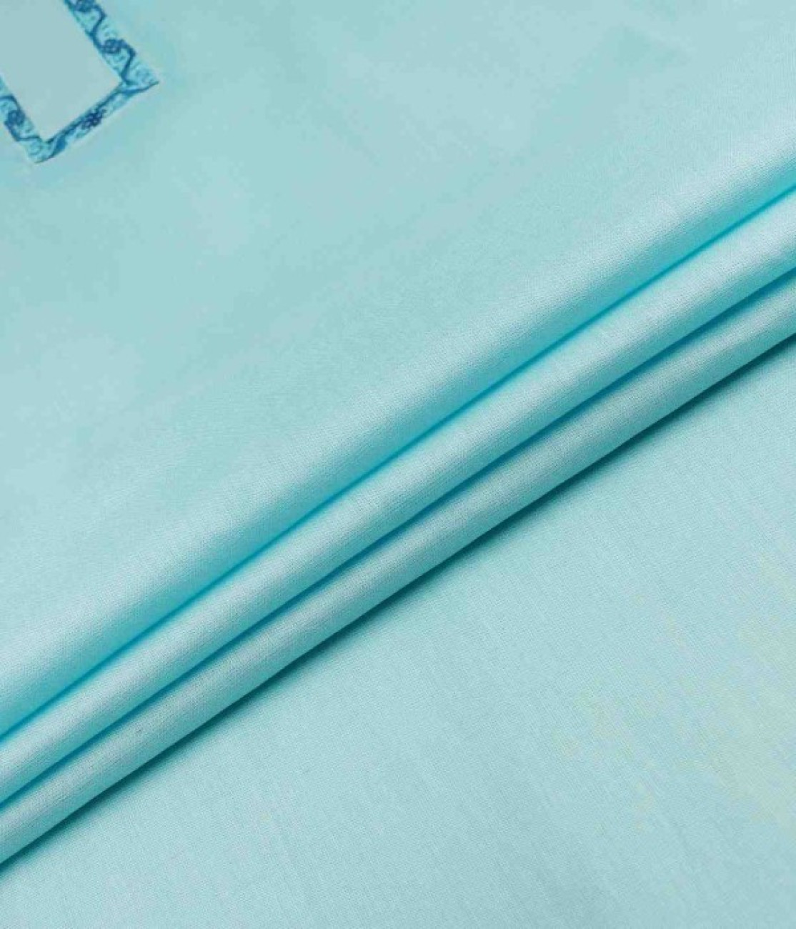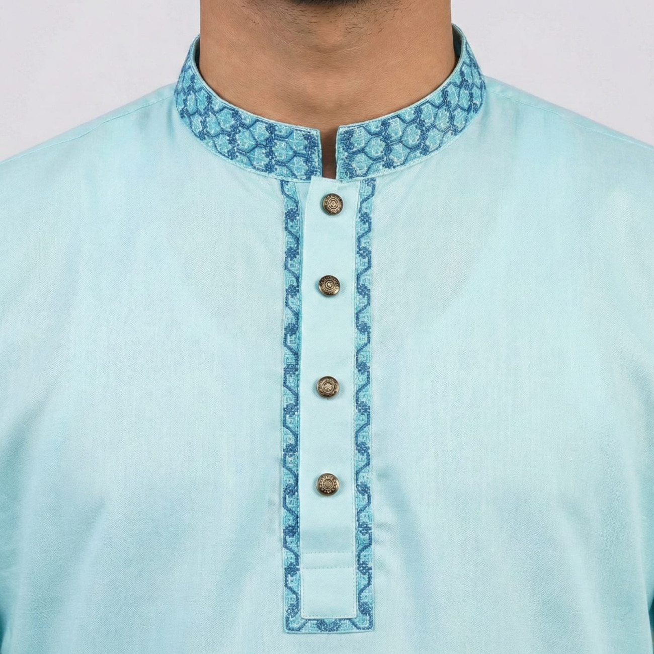Sky blue slub cotton Panjabi with contrast embroidered collar, placket, and cuff detailing. Comfortable and breathable fabric, ideal for festive and casual wear.